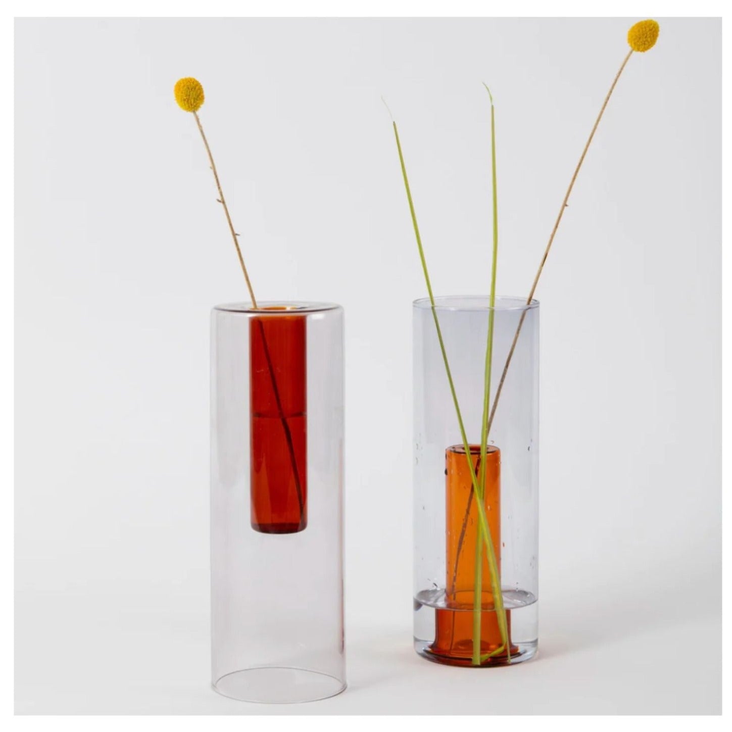 Two glass coloured vases in one, they’re designed to let your creativity flourish and make you fall in love with flowers again.Handmade tall glass vases